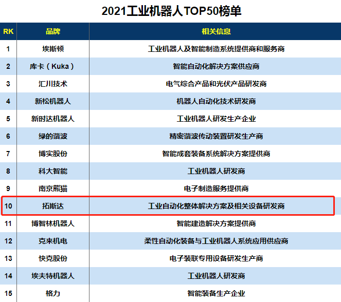 此前,拓斯达亦入选“2021工业机器人TOP 50”“2021广东企业500强”榜单,分别位列第10名、第417名。