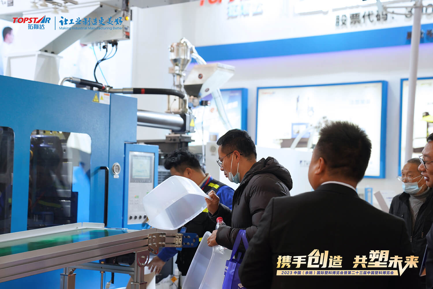 余姚塑博会期间,拓斯达携TH550、TM170Ⅱ等注塑自动化装备登陆。现场展示深腔收纳箱塑型工艺方案和可循环使用快餐盒工艺方案。精准、稳定的注塑装备与高效的配套辅机协同运作,成品率高,质量稳定,吸引客商驻足交流。
