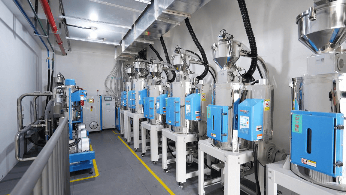 全面规划是智能投产的关键一环。通过与佳伯尔共同探讨理想的生产模式,我们的智能注塑整厂规划工程师利用数字仿真技术制定了标准化的模块,综合布置各类管线,中央供料系统的应用成为实现佳伯尔智能化生产的重要一环。该系统的自动化和智能化特点使得注塑生产线更加高效灵活,同时降低了人力成本的投入。
