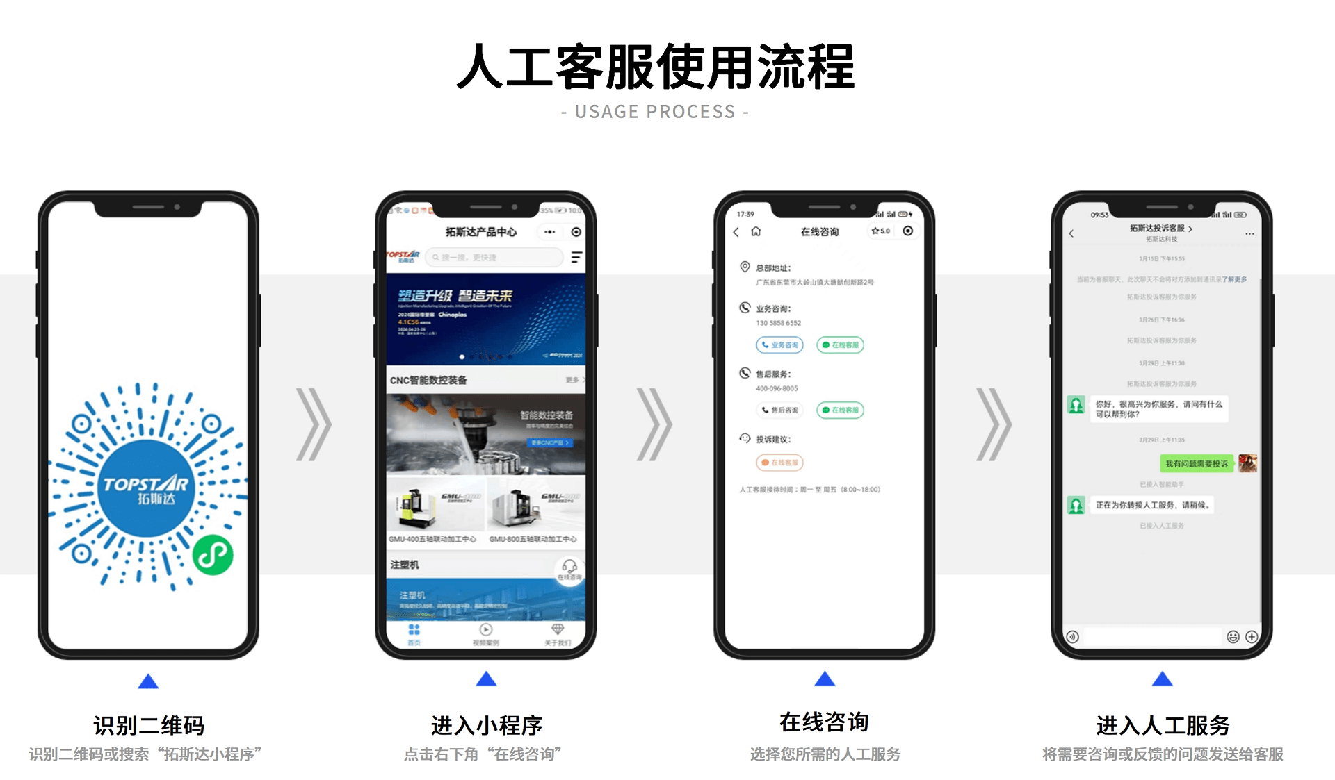 拓斯达始终把客户的需求和反馈放在首位,为此,我们在小程序设置【在线咨询】功能,客户可以直接向企业反馈在使用产品或服务过程中遇到的问题,让每位客户都能轻松地与我们对话。
