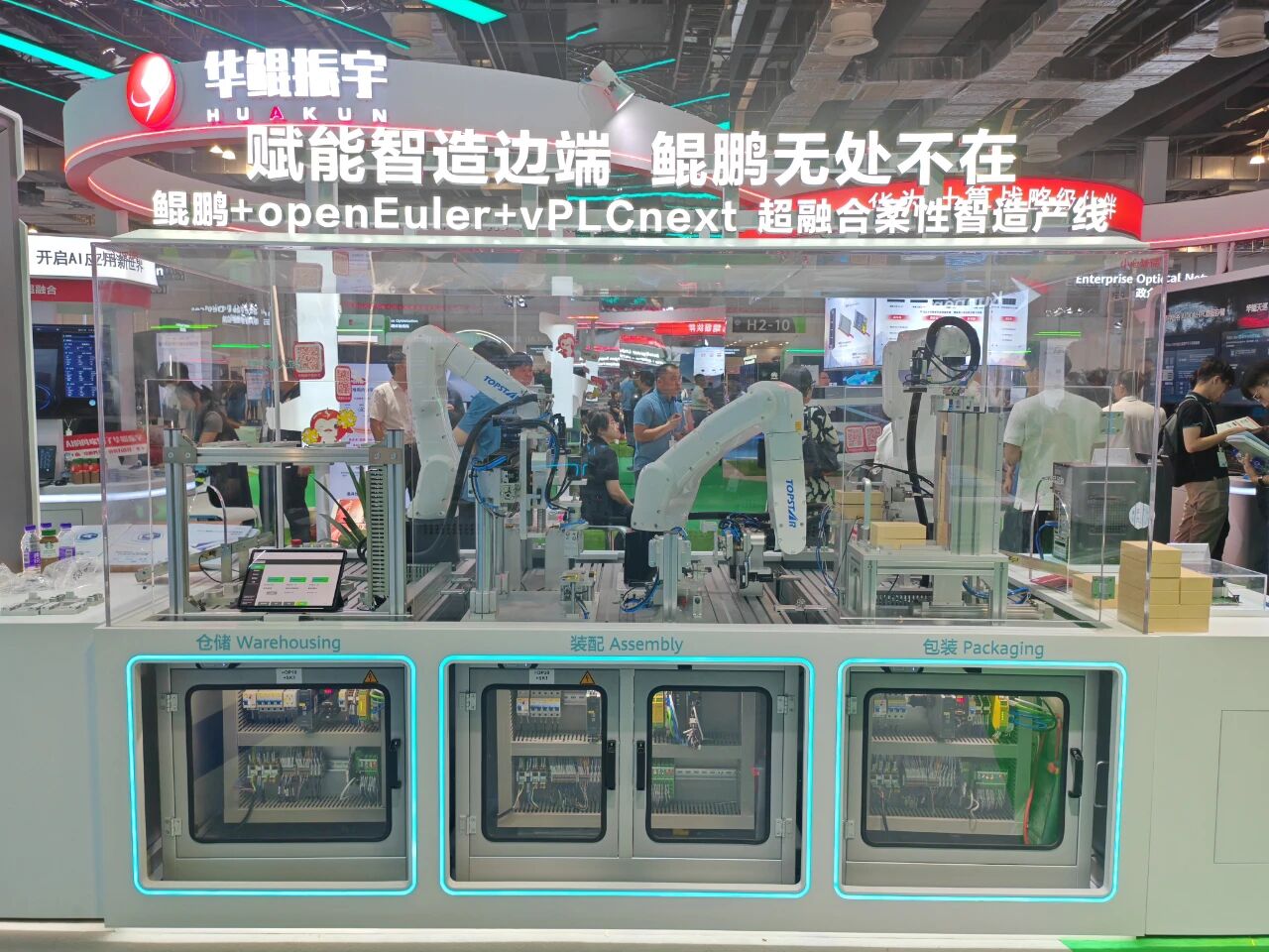 与此同时,面对传统制造业“改不动、连不通、反应慢”等痛点——如产线柔性不足、转产困难、系统协同效率低、难以响应小批量定制需求等,拓斯达联合生态伙伴于大会现场展出鲲鹏+openEuler+菲尼克斯+拓斯达OICT超融合柔性智造示范线,展示未来工厂的雏形。